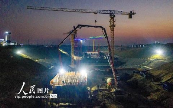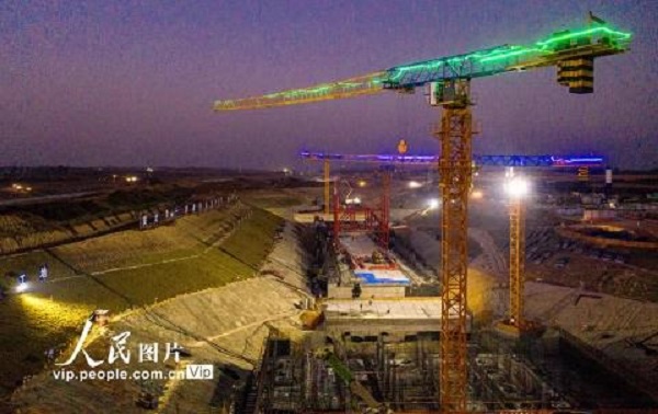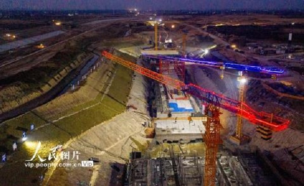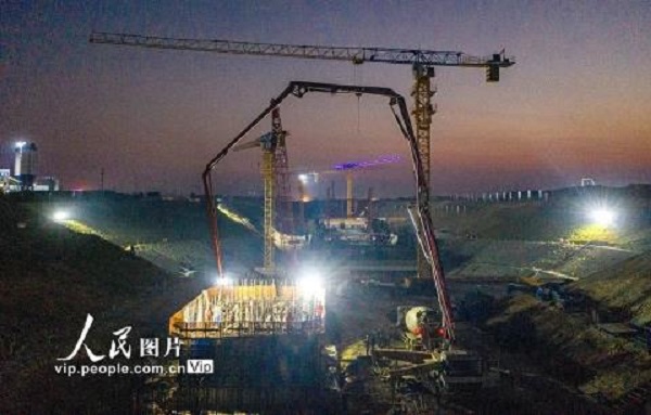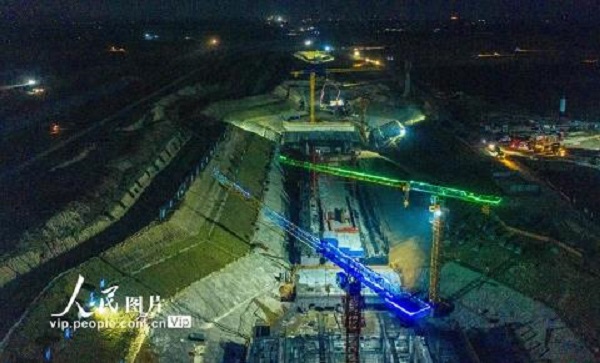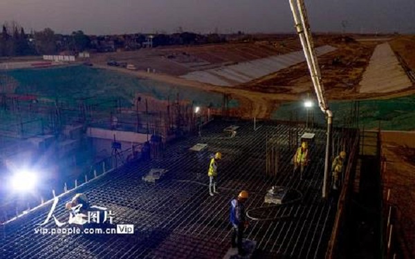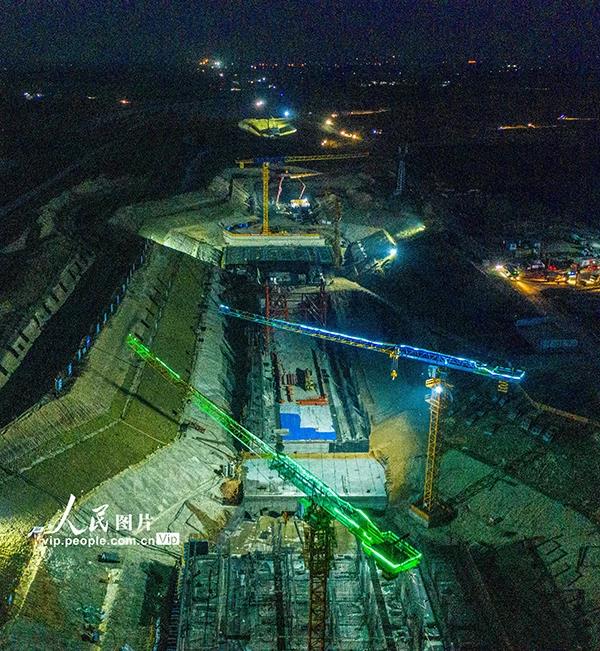 2020年11月15日,引江濟淮工程安徽省合肥市廬江縣廬城鎮(zhèn)廬江節(jié)制閘施工現(xiàn)場,建設者們正挑燈夜戰(zhàn)加快工程進度。
