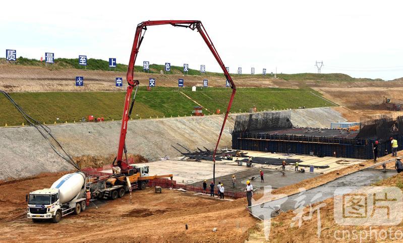 在引江濟淮工程安徽省合肥市廬江縣萬山鎮(zhèn)永橋村廬江船閘施工現(xiàn)場,中交第二航務工程局有限公司的建設者們正在施工廬江船閘閘室底板墊層混凝土澆筑。