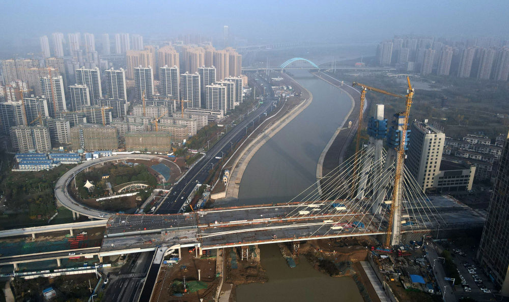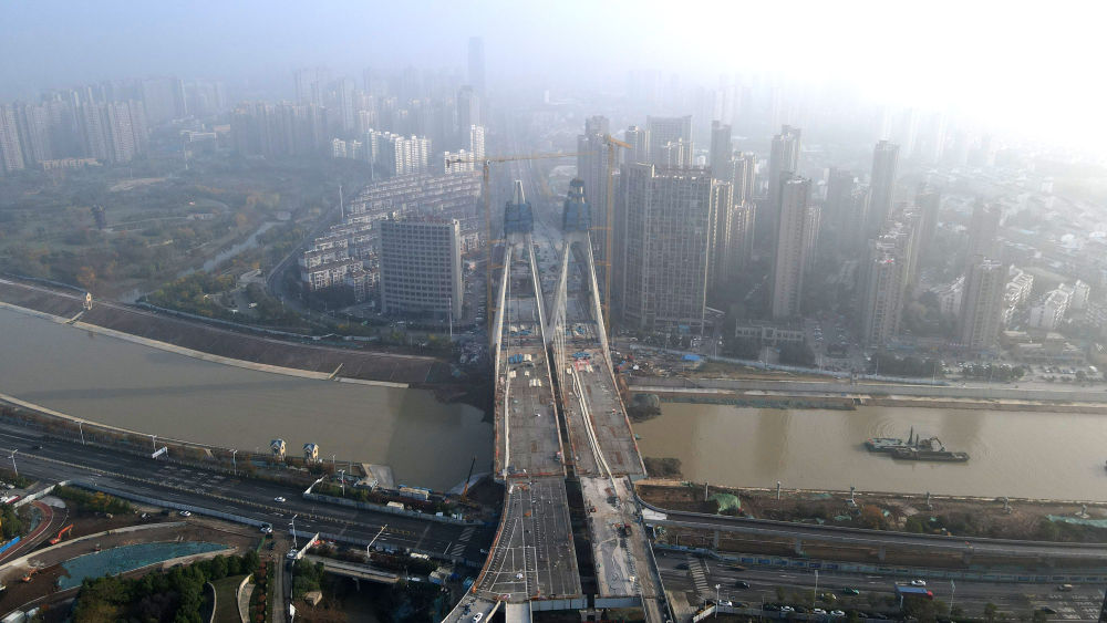 ↑這是正在進(jìn)行主塔封頂施工的引江濟(jì)淮金寨南路橋(11月24日攝,無(wú)人機(jī)照片)。