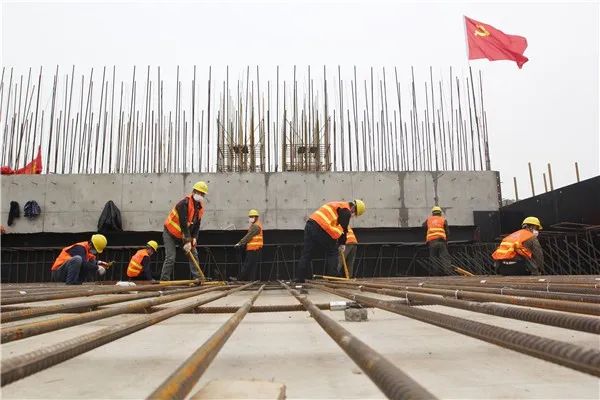 在引江濟(jì)淮工程樅陽樞紐節(jié)制閘施工現(xiàn)場,從高處望去,工地上一片繁忙景象,幾臺挖掘機(jī)揮動著“機(jī)械臂”,戴著安全帽和白色口罩的工人們正在鋪設(shè)鋼筋。